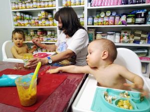 At 12:25 Sonja and Randy fed them their lunch meal, and then they went back downstairs. Once a week Randy cooks omelets, and today was the day. He made me one and brought it to me in the bedroom. While eating, I could hear Sammy crying hard. He often needs one of us around to not cry. I ate as fast as I can, and then went downstairs to hold my Sammy baby. All three were pretty tired, and so they went to bed at 2:15 for their afternoon nap, which is their regular bed time. This time it took Tammy 25 minutes to fall asleep, while the boys go to sleep fast, and she only slept 35 minutes. Right after she fell asleep, Sammy already woke up, half an hour after lying down, and his crying woke up his brother. The boys often wake each other up, and during the night usually drink at the same time because of that. So they got up at 2:45, and Randy and Sonja fed them their afternoon meal. When Tammy woke up at 3:15, Sammy was just finishing his meal, and it was her turn to eat. Then she went downstairs to join her brothers.