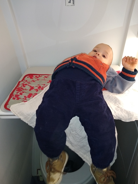 We walked onto the plane and found our seats - the exact same ones as last time. We noticed all the empty middle seats, which they had not done last time, but France is also in a stricter lockdown now than it was back then. We put up all our bags and tried to settle in. We still had a lot of time, and Emmy and Tammy enjoyed getting to move around again. One flight attendant was really nice and was playing with Emmy. From then on he would constantly smile at her, even though sometimes she was busy and never looked back at him. Him and his sister were exploring everything in the area, and I had to pull them out of the way whenever people were coming and needed to pass through. Emmy checked out the emergency exit, and Tammy the earphones and blankets on the seats. And Emmy loved playing peek-a-boh as there was a thin wall just in front of us, and he could walk around it. They were having fun. And time passed slowly until the scheduled take-off of 11:55 pm. Emmy had a dirty diaper, so I went to the changing room to change him. Those changing tables are sure small!