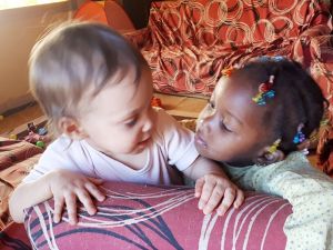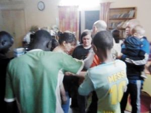 Our last day in Mali was busy. We had to finish packing, and it wasn't always easy when the babies wanted our attention, and we couldn't give it to them. But for the babies, the day wasn't any different than any other. They ate well, and in the afternoon the boys slept, but Tammy was wide awake and never took a nap. Barbara also went to take a nap, and so I got their dinner ready and just Randy and I were feeding them - until Barbara returned, only to find out that he had been at the door twice and we had not heard her knock. The babies went into the bathtub as always, but then we put their bodies and pants on instead of pj's and put them to bed. Normally I'd sit right next to the bed until they'd sleep, but I had too much to do to do so. Tammy fell asleep after a while, but Emmy ended up running around bed without lying down to sleep. When our Malian kids came over just after 7 pm, I got him out of bed and took him to the living room, and so he joined our last meeting, which he greatly enjoyed.