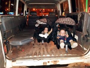 As Tammy was really sleepy, not having slept that long, I decided to put her into my baby carrier, and so the boys went into the car seats. Sammy ended up on the floor between us, Emmy on the bench with Randy, and I was on the opposite bench with Tammy. It was nearly 8 pm when we waved good-bye and drove off. All the kids were happy and curiously looking around at everything, probably wondering what was going on. Tammy had the best view, and watched all the traffic around us. The traffic in Bamako is really bad, even at 8 pm still, but we still got to the airport in decent time.