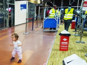 Next stop was the check-in. There was a nice guy at the counter (guys are often nicer than ladies), and I explained to him that Barbara and the third baby had to be closer to us or it wouldn't work. In return he explained that the middle seats are left empty because of Corona, so I answered that we were all one household. He finally said he had to check with his superior. It all took a while, but in the end, he had done it, and Barbara had the third, empty seat next to us. Thank God! I was also relieved that we could keep the stroller all the way to the plane.