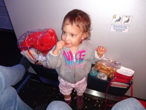 As it was getting later and later, they started getting more cranky, as they were really tired. Emmy had not slept since his afternoon nap! And when he gets overly tired, he throws a fit, cries, and will not be comforted, and that's what happened. He's strong too, and all I can do is trying to restrain him and hold him until he gives in, closes his eyes and falls asleep. And he finally did. Thankfully I had already put his baby seatbelt on, so he was all good to go. Next to me, Daddy was already asleep, while Sammy in his arms was not. And the girl was still wide awake and stayed up for a long time. She was also getting more and more cranky, and just wanted to be with Mommy, which was not possible. Barbara had to restrain her, as we finally took off. Once in the air, she was able to turn around, and I was close enough that I could put my head and my hand on her head, even though she was still sitting on Barbara, as mandated, and then she finally fell asleep. And so did Sammy. Before we took off, Randy went to change Sammy's diaper. He's now the only one still having diarrhea, and his body and his pants were dirty. Unfortunately I did not have any extra pants, only extra bodies, so he ended up having no pants to wear for the rest of the trip. Poor baby. We wrapped a blanket around him to keep him warm.