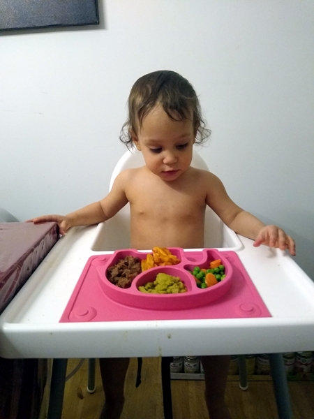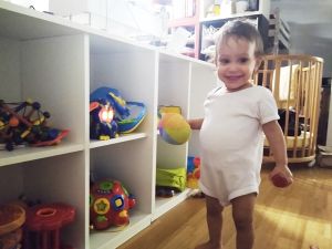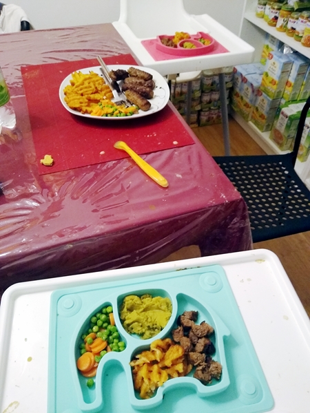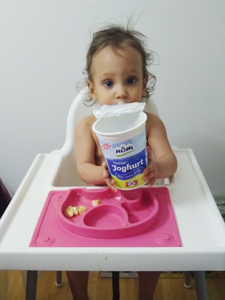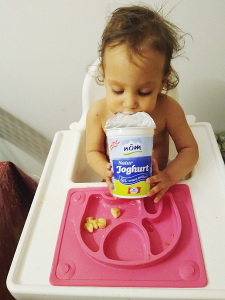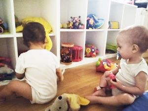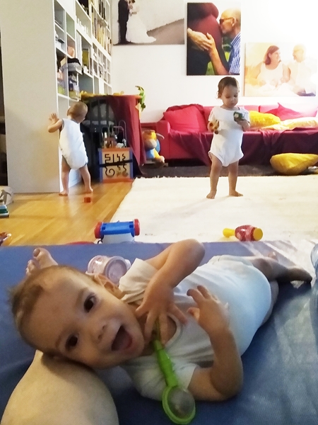 And then we went back downstairs where it was finally my chance to stay with them, which I greatly enjoyed. I loved seeing them so happy and playing joyfully. As they had eaten lunch around 1 pm, it was around 3 pm when we went upstairs for their afternoon meal. I got out one of the cereal-fruit jars they like so much, and they were empty in no time. Again I had to bring out some other food (bananas and yoghurt) to top it up.