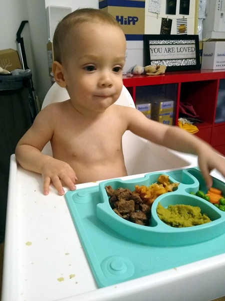Once we were all up, Randy took them back downstairs while I went to work cooking lunch. All they ate in Mali were homecooked meal, and I had decided to start that way in Vienna as well, even though there are still jars that need to be eaten. I still had some food in the freezer, even without the grocery delivery. And so I made meatballs with fries and carrots and peas. I also had one baby food jar of mashed potatoes with spinach left, that they loved eating. Once everything was ready, I went downstairs to get them again. They weren't too crazy about the meat balls and fries, but enjoyed the vegetables. And then I got some bananas and yoghurt, which is their favorite foods. All in all, they had eaten well. Not so much Sammy who ate so little that he needed a bottle of milk.