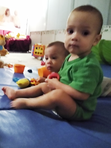 I cleaned them up and dressed them and went to bed, while Randy went downstairs with them. Just over an hour later, he came back upstairs with them, put the boys to bed, and the girl on me for her nap. It took her a while to fall asleep, as always, but then she slept for a good while, until after noon, and so did the boys. So it was late again before I got to start cooking lunch for the five of us. In the meantime Randy went downstairs with them. However, they seem rather fixated on me right now, and as Emmy was so upset I was leaving, I just took him upstairs with me. However, he wouldn't even let me put him down on the floor for a few seconds, which made cooking rather difficult, with a baby on my arm. A few times I had to put him on the floor anyway, against his will. It was about 1 pm when the food was ready - rice with chicken and vegetables. I opened a baby jar of pure pumpkin puree and added it to their rice; it made it less dry, and they love pumpkin, and they ate all their food! Especially the girl has been impressing me with how much she can eat. By the way, this morning they all had normal stool, but later in the day Emmy had some diarrhea again.