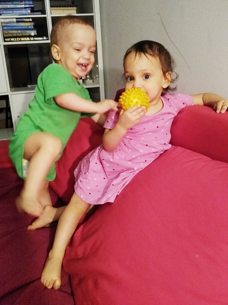Emmy and Tammy are excited to be able to climb up the couch all by themselves now - whereas Daddy is not at all excited about that. Mainly because of a low-hanging picture they like grabbing, but also because of the danger of them falling off the couch. I had to get up and go over to the couch more than once because they had climbed up. Of course, they are over the moon about it, as you can see in the picture.