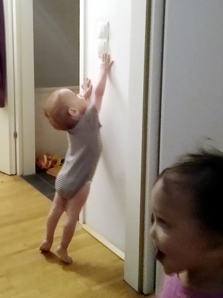 Another skill is turning the lights on. Today I saw both Tammy and Emmy turning the light on in the hallway. However, they can't turn it off yet, as the switch needs to be flipped up for that, and that's too high so far.