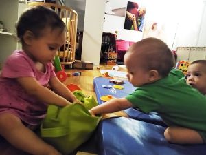 I'm also impressed by Tammy's desire to tidy up. Today she was picking up bricks and putting them back into the bag. Yesterday, when I let them ouf of the play area to walk to the staircase and go up, Tammy stopped to pick up a bottle that was sitting on the floor and took a few steps to put it inside a box. She returned twice for more bottles and did the same thing before I got her so we could go upstairs. Our tidy little girl!