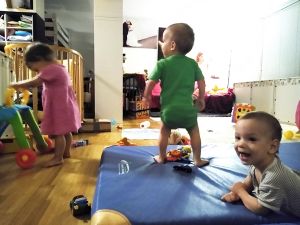 They were getting tired too, and so we went upstairs for their nap. At first Emmy protests, but then he falls asleep fast. I lay down with the girl, but it soon became clear that she was not ready to sleep. I was more tired than her. After a while I got back up with her and fed her her afternoon meal, a cereal-fruit jar, then went downstairs with her, where the two of us played. When the boys woke up, I ended up feeding Emmy, while Randy fed Sammy his afternoon meal. Then we all went downstairs to play. At 5:30 Randy took my place so I could go upstairs and make their dinner. The girl hadn't slept and was tired, and Emmy wanted to be with me as well, so they were both screaming at the top of their lungs when I walked away.