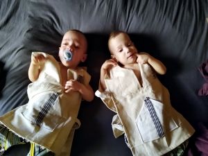 As for the antiobiotic, we have to give it to them every 8 hours for a week. They had the first dosis in the afternoon, and the second one was scheduled for 10:30 pm. Emmy was up before that, so we gave it to him, and then his bottle of milk. It's also a sryinge that we squirt it into their mouths with. At 10:30 we woke up first Tammy, and then Sammy, to give it to them. I had already changed Sammy once, as the diarrhea is so bad, it leaks out and his pj's were completely wet. Sammy did not want any milk, but the girl had some. And since then they've been sleeping peacefully.