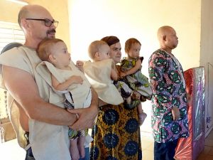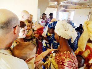 Our weekly service is at 3 pm on Saturday, and we were supposed to come in at the end of the service last week, which didn't happen because I was sick. As today is our last Saturday in Mali, we had to do it today. I got dressed, and then got up one baby after another, putting their Malian clothes on. Emmy always wants to be held after he wakes up, so he wasn't too happy that I couldn't do that.