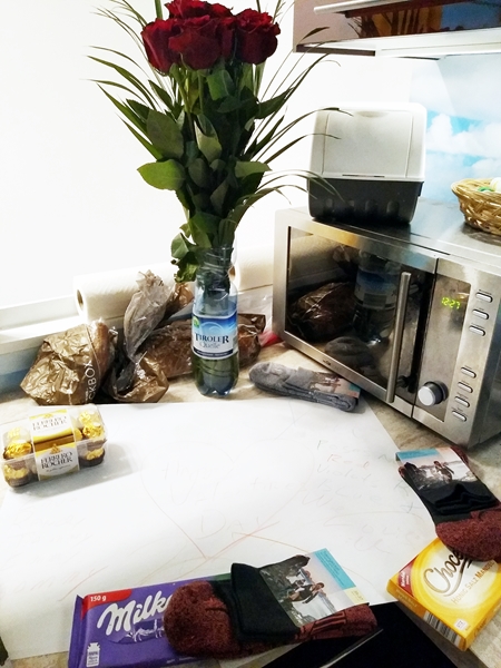 Last night it was 3 am again, when I went to bed, and the littles ones woke up at 8 am, as usual, though Randy had to give 2 out of 3 some milk two hours earlier. I made their breakfast, and we fed them, then Randy took them downstairs, while I went back to bed. When my alarm woke me at 11:40, so I could put their food into the warmer, I fell back asleep without getting up. I woke up half an hour later, annoyed, turning the warmer on, which meant more waiting time for them. However, I was surprised that the boys were still sleeping, as they're usually up before noon. I went to the kitchen to start cooking for us adults, when I found Randy's Valentine's gift - roses, chocolate, and a note. How sweet! I gave him my gift later: peanut butter and American mayonnaise.