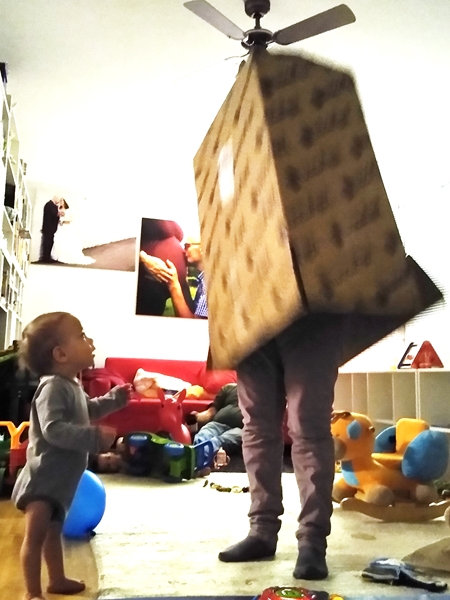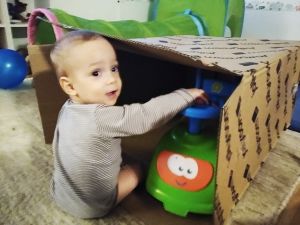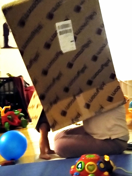 Today their sleds arrived in a big box, while we were eating, and Emmy loves boxes anyway, so his eyes lit up. I cut the box open and let them check it out. We then took the box downstairs so they could play with it, and they had lots of fun with it. Emmy was a little hesitant to crawl inside. I made it into a garage at one point, putting the car and tricycle inside, and Sonja decided to put herself inside, one time together with Emmy.