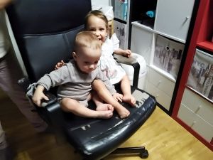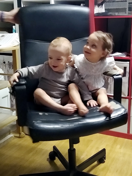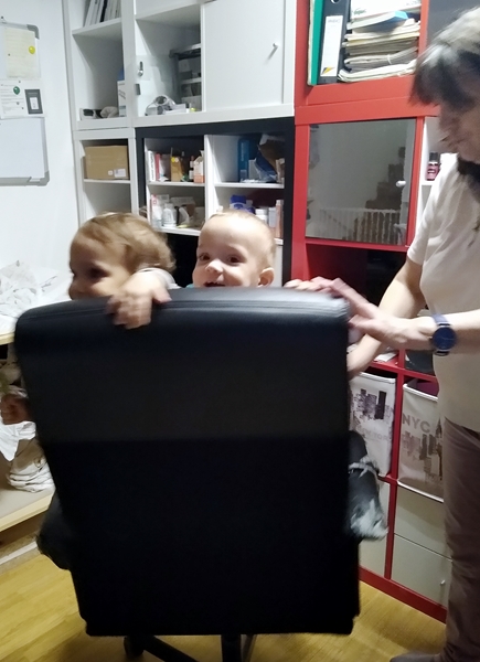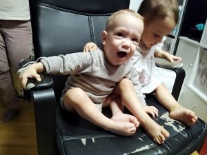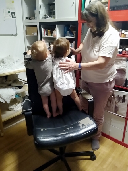 At 3 pm we went upstairs to eat cereal with fruit, before going back downstairs to continue playing. Emmy and Tammy were EXTREMELY cranky this afternoon, tired, crying, wanting to be with me. Their nap was definitely too short! We let them out of the play area, let them get on the swing, and then put them on my old office chair and started turning it, which they enjoyed. Thank God for Sonja, who kept coming up with ways to keep them distracted and busy.