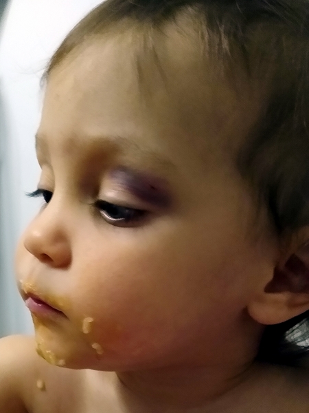 Remember, I told you yesterday about the accident she had in the bathtub. She was jumping up and down, holding onto the edge of the bathtub and then hit the edge. Her eye looked bad last night, and I was surprised how much better it looked in the morning. You can see her blue eye really well in that one picture.