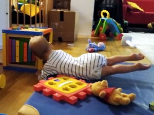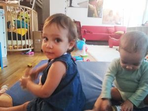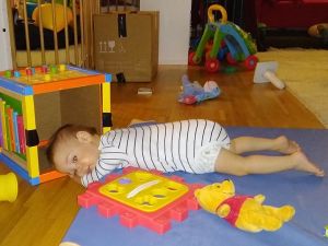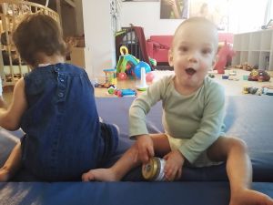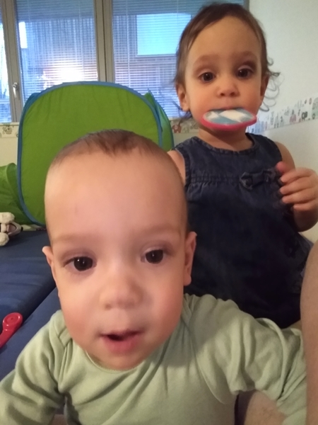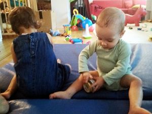 So at 4 pm all three were downstairs again, and we had lots of fun. Emmy was really tired, so I had to really keep him busy and throw and twirl him around. I also pushed both him and his sister on the tricycle in a circle for quite some time. When they were happy playing by themselves, I played with Sammy, who was a little cranky at times as well.