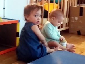 At 3 pm I got two fruit porridge jars out to feed them downstairs, so Sammy would not be woken up. They ate it fast, and then were very interested in the jars. Emmy tried putting the lid back on, which is not even easy for me, and then kept putting it on and taking it off for quite some time. And his sister started doing the same. I'm glad it kept them busy, and it was a good exercise.