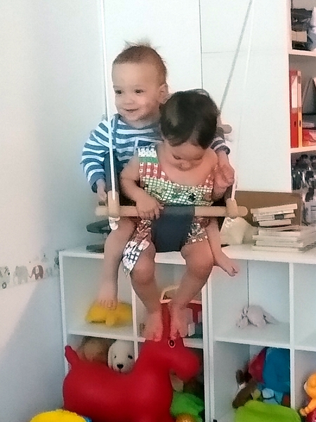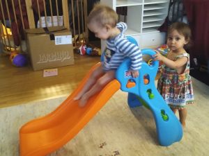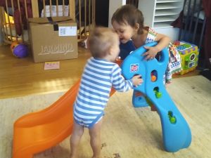 We had lots of fun for the next two hours - reading books, the swing, the slide, opening and closing blinds, throwing Emmy around, when he's cranky. When Sammy woke up, I went to get him, and he joined us in the fun.