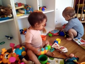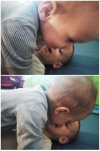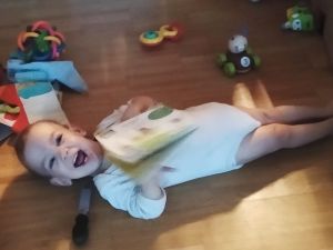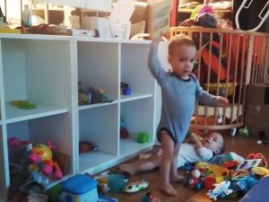 I held Sammy for a few minutes to calm him down, and then put him to bed. It didn't take long for him to fall asleep. I was glad that the girl fell right back asleep after raising her head. I was up for good now, and as Christine was about to leave, I got myself a sandwich and went downstairs to be with Emmy. We had Mommy and son time, just the two of us, and had lots of fun. I had my tea there and told Emmy "heiß" (hot), when he got close to it, and for the very first time he repeated "heiß" back to me, several times. It was so cute and so exciting! They are now repeating our words in such a way that we understand more and more often.