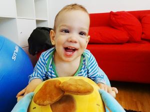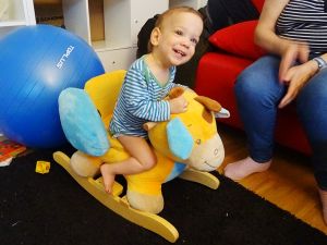 And I had a fun time with them, reading books, chasing them and making them laugh. Emmy decided to go into the gap between the bars and the couch, but did not like it at all. He was stuck, and we had to rescue him. I put Sammy on the rocking horse, and he always smiles for me, when I take his picture. He put his head on the head of the giraffe (that's what it really is), which was so cute, but as soon as I'd get the camera, he'd lift his head again.