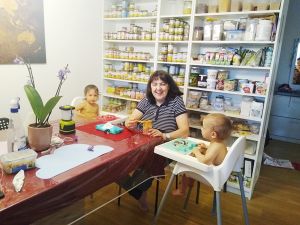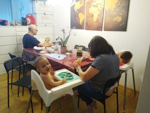 My alarm woke me again at 11 am, so I could put the soup on the stove to warm up. I went back to bed until Sonja arrived at 11:30, when I needed to open the door for her. The soup wasn't really hot yet, so I turned up the heat, and started getting things ready. A few minutes later they were all able to come upstairs to eat. It's a little messy, a lentil soup, with quite a bit landing on the floor. They had some fruit and yoghurt after the soup, and then I took Emmy to the bathroom to clean him up. Sonja brought Tammy, I cleaned her, and I left them there to get the portable vaccuum cleaner out. They are afraid of it and cry, so this way it worked out good for me to vaccuum up all the lentils.