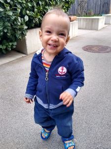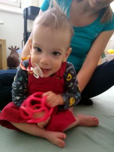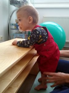 It's finally getting warmer again, which is nice, though the wind was a little cold. We took two subways and then had to walk a little, and got there at just the right time. At first Sammy was unsure, but I reassured him, and it didn't take long before he was happily playing and letting the physiotherapist do whatever she wanted. He really enjoys himself there, and time just flies by. It's not like that in the hospital at all. Today the therapist put him on all fours, to see how he was doing there. And because I told her how much he likes standing up, he was working with him on that and showing me what is important for us to do when he does. We both had a great time, and it feels pretty fruitful. Next time Randy is taking him for the first time, so he can find out what to do firsthand.