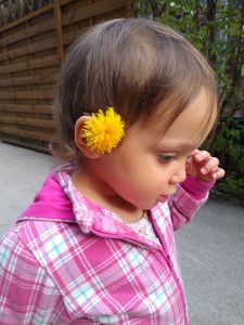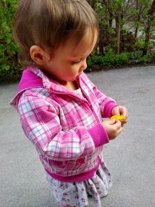 There were daisies and dandelions blooming everywhere. I pulled some off and tried to give it to them to check out. Emmy was afraid and wouldn't take them. I put one behind Tammy's ear, but she took it off right away. And when I asked her to take it to Daddy to show him, she threw it away.
