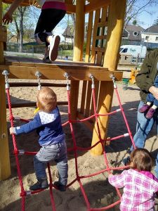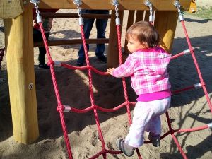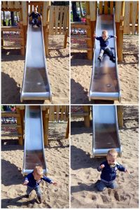 The round swing they can all go on was first. Then we moved on to the bouncy animals, and they enjoyed them for a while, while watching the kids around them. Randy took Sammy to the slide, and he went down a few times, enjoying it. Then Tammy and Emmy walked over there too, and the fun started. We first went to the net to climb up on to the get to the top and to the slide. I helped them, but they did pretty well and got to the top. Then they started sliding, and making it very clear they wanted to go back up there to slide again. We would just lift them up to the platform, no more climbing. Even Tammy enjoyed it greatly, while she doesn't care much about the little slide at home. And she surprised me, when she lay down and slid down on her belly, feet first, and she did several times. Courageous girl, and coureagous Emmy. Emmy would slide down and fall forward on his knees for a while, but then he managed to just sit, and even keep standing. Tammy kept standing from the beginning.