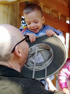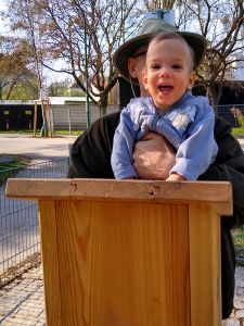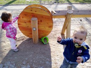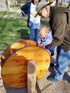 Then we moved to the last installation we had not checked out yet. It was actually for water running down a contraption and making the wheel at the end move. I guess the water will be on in summer. Tammy enjoyed turning the wheel, and Randy let Sammy turn the wheel too. And Sammy got to take position behind the "pulpit", our little prophet-preacher!