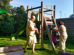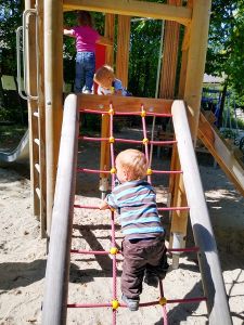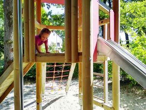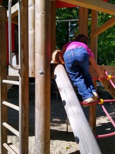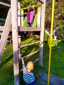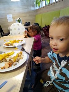 We put our masks on and went inside to the reception desk. We showed them our test results, filled out a paper, and received our key. Then we went to the room, where I stayed with them until Randy had brought up all our stuff from the car. The kids were wild, checking everything out and pulling on everything they could find. Sammy was still cranky from not having slept. I was unpacking, when our friends arrived. I have known her for a very long time, and she used to be my best friend. We stayed a little in our room and talked, and then went downstairs to the hotel restaurant. It was pretty full outside in the garden, and they put another table together for us. They also gave us two high chairs, which is not a good number. Sammy needs one, and then the other two should each have one or neither one. It still worked out today for the girl to sit in it and Emmy to sit on a normal chair. They kept asking for food, not realizing that you have to order and wait, and it took pretty long for the food to come. Thankfully there was as slide right there. They needed a little help getting up there, and any one of us helped them at times. Once the food came, I cut the meat up for them and put it on their individual plates with fries, and they started eating. They ate pretty well, mainly fries, and then left to go to the slide again. Sammy was now beyond tired, just cranky and crying for much of the time. It was time for them to go to bed. So we said goodbye to our friends and went to our room.