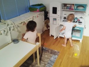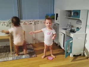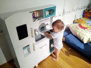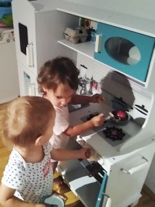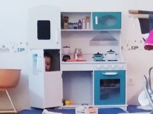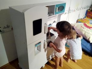I was not done, but it was getting late, and I could hear the kids cry and Randy needing a break, so I went downstairs just before 5 pm. We then had a fun time. Emmy has a Tigger doll that talks and jumps, which is really funny, and he would put him into the fridge of their new kitchen, touch the button, and close the door, so he was jumping inside the fridge, which was hilarious to him.