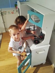 I cleaned them up, brushed their teeth against their will, dressed them, and went downstairs. I couldn't wait to see their reaction to their new kitchen. They immediately went to check it out, Emmy first. It was so much fun to watch them that I didn't even open the blinds for a while.