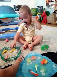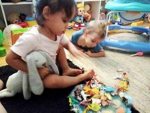 A set of toy plates and silverware had arrived that I gave to them, and we played some pretend eating. Then Tammy wanted to look at a picture book, and then Emmy wanted to play with the little animals, so I got them out as well. We have a little, blue pouch of water that I put down, and I set the little fence up. I was impressed how the girl then picked up one animal after another and sorted them - water or land - and put them in the correct spot. Very impessive. She's very organized, like her Mommy.