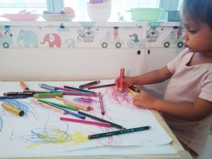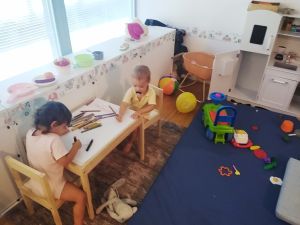 After the animals, they wanted to do some drawing, so I gave them paper and the crayons, and they did a great job. By the time they were done, it was 5:30 and time for me to go upstairs to make their dinner. Of course they didn't want to let me leave, and so I just let them go upstairs with me. Again, chairs set into the kitchen, and their plates in front of them on the counter, and then I started making bread with cream cheese and putting it onto their plates. But of course they wanted salami; only Emmy ate the bread as well. Once I was done with it all, including all the fruit, we sat down at the table to eat. What they didn't eat we took to the bathtub. They didn't eat all their food today. Emmy was getting really cranky in the bathtub, because he was so tired, having only slept that one hour on the floor in the morning. No wonder. We got them out and ready for bed, and Emmy probably set the record for how fast he fell asleep. It was a different story for Tammy. I tried to leave a few times, but she wouldn't let me. At least she wasn't crying for Daddy again. I had to stay until she was asleep, which did not take as long as usual, thankfully. I left to get myself something to eat, and then went back to work. I took a break from mental work and cleaned the kitchen and dining room, before returning to the computer. Now it's midnight and I cannot keep my eyes open any longer. Too bad as there's always more work to do.