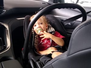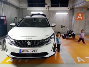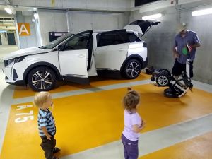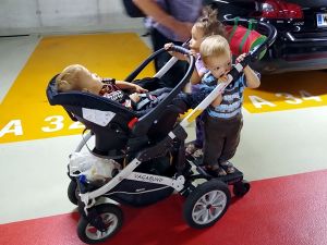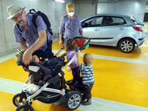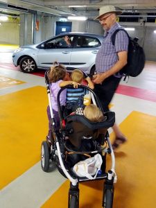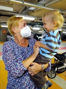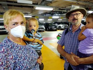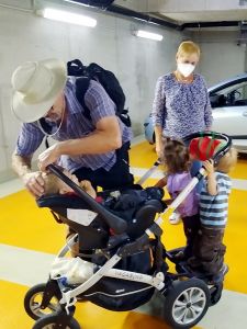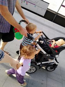 We had found a solution to the dilemma of Sonja not being available. My Mom agreed to come meet us there and then take the car seats with her in her car, while we take the train home. She had a little difficulty finding us there, but then she drove up. We were all already outside the car waiting for her. When the kids saw her, they got all excited and Tammy ran to my Mom who picked her up. Emmy waited for her to put down Tammy, and then it was his turn. Sammy was also excited to see her. We gave her the car seats, she gave us a bag, and then we already said our goodbyes again. She was so kind to take the car seats to our house right away, as she said it was unlikey we'd see each other soon due to the rising Corona numbers. As for us, we had the single stroller with Sammy in his car seat, and the attached board that Emmy and Tammy both stood on at first. But it was a lot to push and soon one of them stepped off and walked instead. We took the elevator up, and when we got to the platform, our train was already sitting there. We just about got on, before it started moving, and it only comes every 30 minutes. What a blessing!