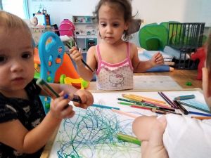 We got off the train right by our house. Tammy and Emmy were both walking, Tammy holding on to the stroller, and Emmy on my shoulders for a while, then on the board. By 4:20 we were back home. We took their clothes off and went downstairs to play. Randy left to pick up some bread and bananas for tonight, as he'll go shopping tomorrow, while we were playing. Sammy was enjoying the swing, we looked at the new August photobook, and then they wanted to do some drawing, as they had seen it in the pictures in the book. And so I put up table and chairs and got down some paper and crayons, and they did a great job. Just as we were finishing Randy returned. Emmy had already been talking about food, and so we went upstairs at that time. It was about 5:15. We sat down at the table right away, and I gave them the food I was cutting immediately. It worked out pretty well. We only had three different types of fruit plus the bread with cream cheese. And I cooked the last ear of corn we had. Randy cut the corn off and gave it to them, and they loved it. And of course they got their puddings, eating the remaining ones we had.