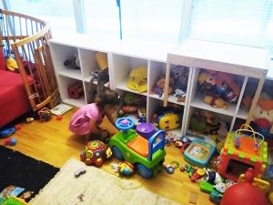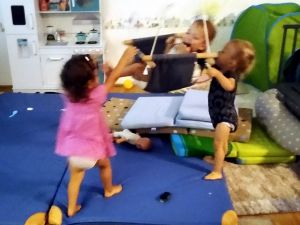 Then I put Sammy in the swing, and Emmy started pushing him and having fun with him, and soon Tammy joined in. Sammy was laughing out loud for much of the time. When I mentioned that we'll have to tidy up today before going upstairs to eat, Tammy immediately started putting stuff on the shelves. I was impressed. But it didn't last long. Emmy also put stuff up a few times, but that was it. I even had to do some stuff twice. But in the end everything was tidied up and looked better than it had for a long time.
