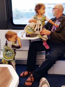 This time the train was pretty full. It was 2 pm. We were able to find some room for the strollers and for us to sit. It wasn't long before Emmy woke up again, but he was still very tired and cranky. Tammy was running around most of the time, while Randy had Sammy, and I had Emmy. I was very tired myself.