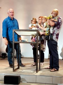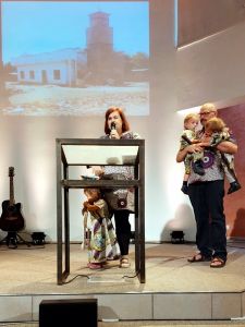 We had some seats in the back of the sanctuary as well, and were there for a little bit. However, the baby room was better as it kept them busy. Then they showed my Mali presentation video, and it was time for us to go up front to talk . Our first time being on the stage like that. I was holding Tammy and Emmy, so I asked Randy to hold the microphone for me. Then Tammy went down, as her rabbit had dropped, and Emmy went down eventually as well. All the while I was giving a great testimony from Mali. Randy was standing next to me with Sammy. Once I was done sharing, the pastor came up and prayed for us all, which was nice.