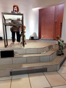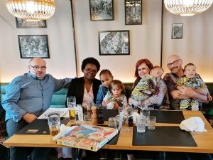 Randy had put the car seats on the strollers, as we were gonna ride a car later. It meant that they had less moving room and didn't sit as upright. We took the 6:45 S-train that took us all the way to the other end and the edge of town, where our train arrived 20 minutes later. When we got on the train to Linz just before 8 am and went to the baby/stroller area, there was just one single guy there, so we had plenty of room. We had just over an hour on the train and forgot to bring any toys. Thankfully Tammy had her rabbit with her, but we should have brought her doll as well that she wants when she's tired, which was the case later. They were having fun, running around, and climbing over the backrest of the bench to the bench on the other side. Emmy also had fun hanging off the railing. They were definitely getting a little bored at some time and were impatient to arrive. We put them back into the strollers, got off in Linz and went outside, where the pastor was already waiting for us with his big car. Emmy especially had already been excited about riding in a car, and now he and his sister were really impatient to get in. However, Randy had to fold the strollers and remember how to put the car seats in, which he didn't really, so we improvised. It was only a 5-minute ride to the church. Emmy sat in the front, and Sammy and Tammy in the middle with me, and Randy in the back. While they can still use those baby seats according to their weight, I think it's time to move on to the next kind of seat as they hardly had any room for their legs.