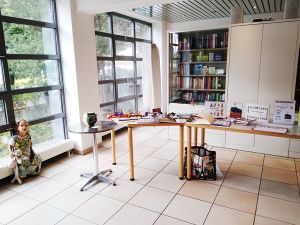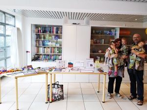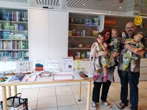 We left the stage and went back to the baby room. Just before the service ended I went downstairs with Emmy and Tammy to be ready at our table. And then the people came, and I regretted not having brought more books with me, as I could have sold more. We had some good conversations and met new people who want to stay in touch with us. It's been so long since we've done this, I really enjoyed it and realized how I'd missed it, but also how important this is. While we were busy, the kids were running around, and I tried to keep my eyes on them and to always know where they were. Some kids came down with balloons that looked like soccer balls, and in the end our kids had received two of them as a gift. Only one came with us, and when I tried to get it out from under the stroller on the train later, it popped, which really disappointed them. But we still have all those balloons from their birthday at home.