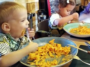 When we unloaded at the restaurant, Emmy woke up but Sammy continued sleeping. We had to say good-by to the pastor, and then went into the restaurant with the family who has a project in Kenia. By now Emmy was also continually asking for food because he was so hungry. They'd had some snacks all morning. We put Tammy and Emmy into high chairs, and Sammy on the floor next to them, where he still slept for a while before waking up and then sitting on Daddy's lap to eat some food as well. We were given the menus that I quickly looked through to pick food for the five of us, while hearing Emmy asking for "Essen". It's convenient that one adult dish works well for three kids, and I got them some pasta with salmon. Of course Emmy kept asking for it, while we were waiting. At the same time I tried to talk to our new friends who I was hoping to give some good input for their project. Our food finally arrived, and it was the biggest plates the little ones have ever had. They gave them dessert forks that they used to eat, and they did pretty well. Sammy wouldn't eat anything though.