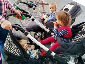 Tammy and Emmy were walking out the building with me, while Randy was finishing up with the strollers. It was a warm, sunny day, and they enjoyed running around in front of the building for a few minutes. When Randy came with the strollers, they got to go sit in them. And this time Sammy had the bottom seat in the double stroller, while Emmy had the single stroller. The whole time on the way to church and back, he was so excited to have this great view, eagerly taking everything around him in. It worked out great, making that switch.