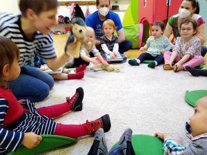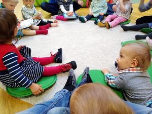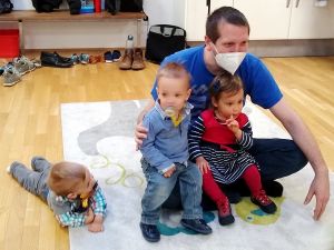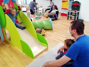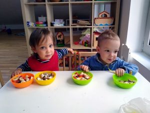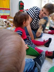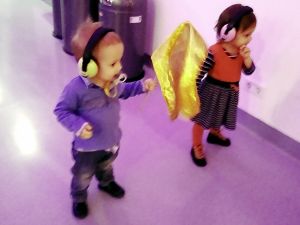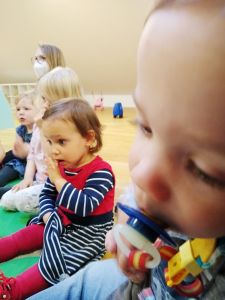 Just after 5:30, Tammy and Emmy and I walked upstairs to go to the toddler room. There was only one other kid in there, which surprised us. We sat down to eat, and as time went on, more and more kids arrived. Tammy and Emmy were so focused on watching the other kids, I had to put the food into their mouths for much of the time.