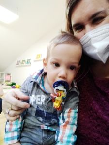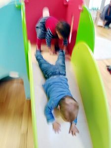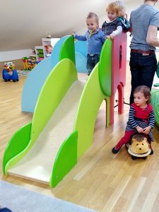 Just before 6 pm, Randy brought Sammy. He had fed him downstairs. At 6 o'clock the kids' program started - their second one ever. The lady did a great job, and the kids listened attentively. After the 20-minute program, it was playtime. As always they had lots of fun on the slide. Tammy sat down by the man at the bottom of the slide, and Emmy sat down with him briefly as well, while Sammy was lying next to him for a short time. At 6:30 Randy came to pick up Sammy, and a few minutes later we also left to return to the sanctuary. Our friend Anna was there, greeting us at the bottom of the staircase. Then Tammy found a soccer ball and was so happy, she would not return it, and was crying, when she had to because the owners were leaving. The service ended, and we talked to a few people. Then we put them into the strollers to leave. On the way out, every woman received a rose because it was Mother's Day. That was so nice! Randy had the kids do a drawing for me during the day, and they gave that to me. And a lady came up to me with a drawing she had made during the service and said that she felt that it was for me. And then she gave it to me. It was a waterfall with Jesus on the top, and an invitation to receive refreshing from him. I told her it was my birthday this week, and that excited her.