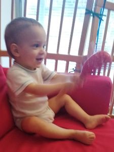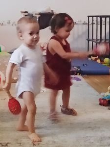 I knew I had to do better regarding nap time. After Tammy and Emmy were cleaned up and dressed (after apple, watermelon, banana and yoghurt), I went downstairs with them, where I played with them while waiting for Randy to finish up with Sammy and put him to bed for his nap. Then Randy took my place and I went upstairs to clean up, and to check on Sammy from time to time to see whether he'd fallen asleep. That's when I went downstairs to get Emmy. It was already 12:45, when I put him to bed, so a good time for him, and I stayed and helped a little, and he fell asleep rather fast. No audience for our comedian. Once he was asleep, I went to get Tammy and put her to bed. It didn't take her long either to fall asleep, at about 1 pm.