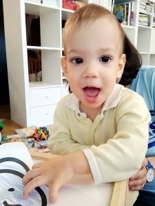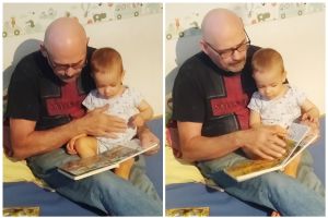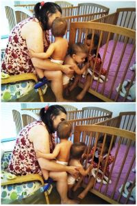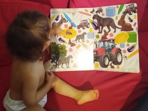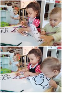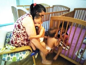 I ended up getting a new age-appropriate coloring book out as well as new crayons, and got the table down. They all stood at the table, while I tried to teach them to color. I did it myself to show them, but I guess they're still a little young for it. They were not happy, especially Emmy, when I put it all away again. We then read some books, but Emmy was rather cranky. When I tried to leave at 5 pm, he grabbed my dress to keep me from leaving, while crying hard.