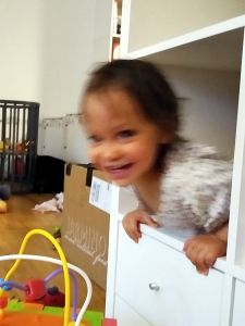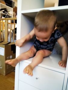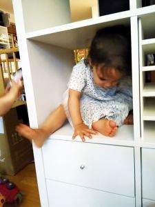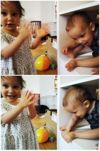 The kids like crawling throug the one shelf where they have access to both sides, and now they can nearly get out all by themselves. I still gave them a hand to get out all the way. They enjoyed it so much, they kept doing it over and over again, and I applauded for them, so they did too,. As for Sammy, he just wants to stand all the time, but needs us to do so as he cannot stand up by himself, and so he gets upset when we're not available to help him stand.
