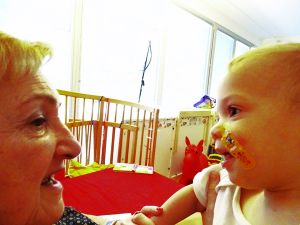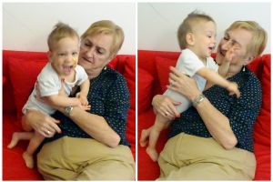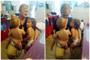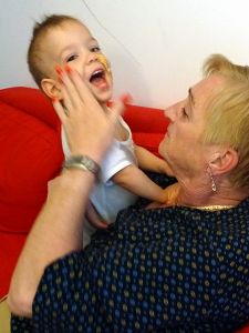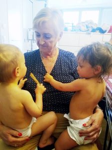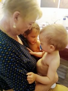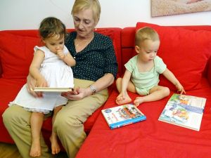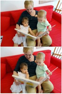 And they had a great time with Grandma. They showed Grandma with their picture dictionary how much they already know, and Grandma brought some books with her to read to them that they enjoyed. They really like books. And they went down the slide to show off to Grandma. And Sammy enjoyed his Grandma time as well. Time went by way too fast, and the two hours Grandma could be with us were over before we knew it. Especially Tammy was upset, when Grandma left, and Emmy said bye-bye for a long time, even after she was gone. Even Sammy said bye-bye.