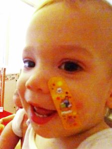 When Randy came, I went upstairs to clean up and then started doing office work. It was a little earlier than usual, and I appreciated the extra time. I was working away, when Randy suddenly stormed into the room with Sammy saying that Tammy had poked his eye out (he likes exaggerating). Yesterday a mug broke downstairs, and Tammy found quite a big shard and cut Sammy's cheek with it. Sammy was bleeding, so I disinfected the wound and put one of the new kids bandaids on that I just got yesterday. The rest of the day Emmy constantly pointed at Sammy saying "aua". Emmy does not like bandaids because they represent pain. Later in the day I took it off again because of that.